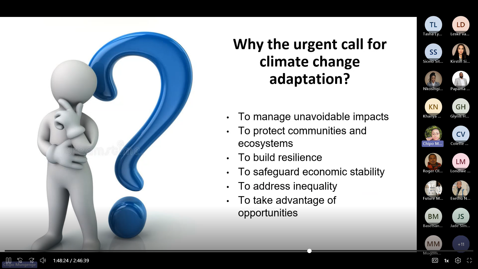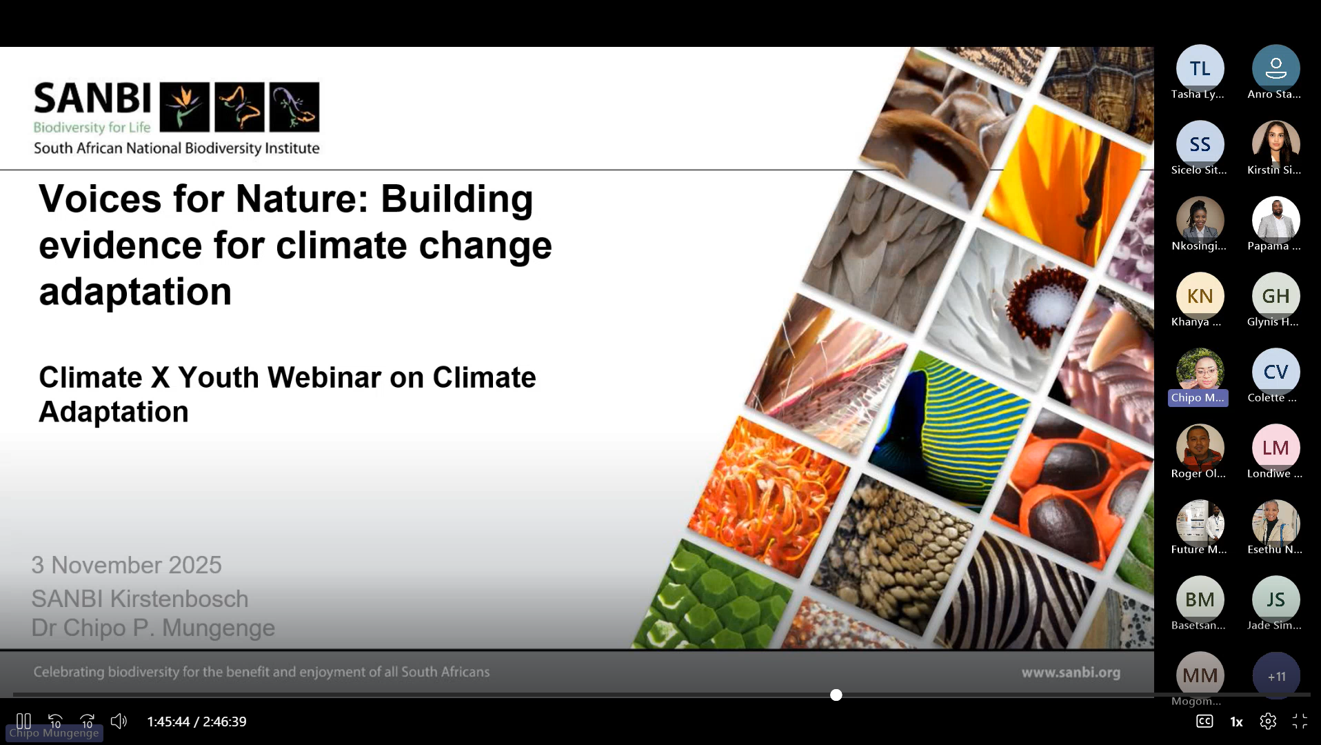 The Youth-Inspired Climate Adaptation Webinar was organised by Nkosingizwile Ndlovu as part of the Climate X South Africa initiative, in collaboration with SANBI, GAUC, UNESCO, and the University of Pretoria. Held on 4 November 2025, the event explored four key themes: approaches and challenges in climate adaptation, practical adaptation strategies across diverse contexts, the role of individuals and communities in driving climate action, and the role of law in climate adaptation. The webinar convened youth, researchers, and practitioners to discuss actionable pathways for advancing inclusive and evidence-based adaptation in South Africa.