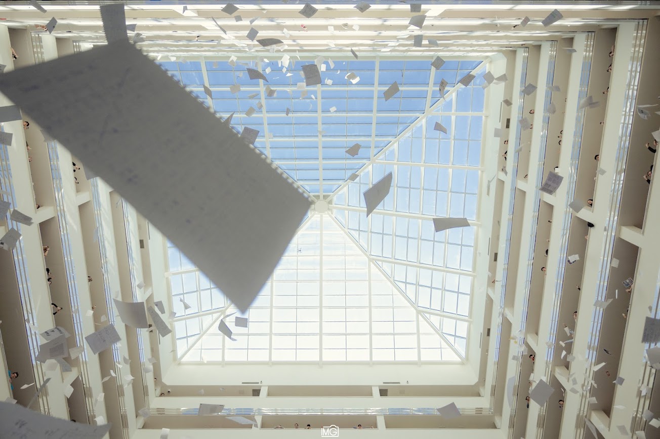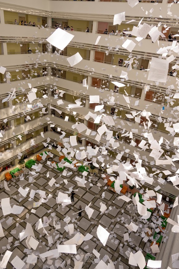 We created chaos from trash to get rid of all the papers collected throughout a semester by our flashmob “Bye, Papers”. In 2018 and 2019, a group of founders of this club gathered students in one dorm block with all their notebooks, paper handouts and announced: throw all your papers off the balconies. And so they did, A4 sheets of paper floated in the air like snowflakes on a winter day, heavier notebooks and notepads flew faster, landing with a crash on the floor. All the collected paper was sent for recycling, and this initiative was forgotten after the transition to distance learning.